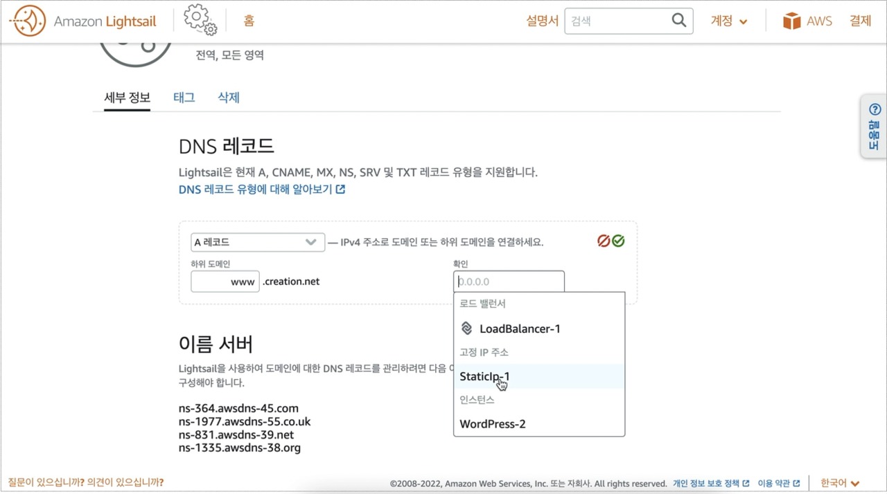 Amazon Lightsail의 DNS 레코드를 관리할 경우, 이러한 도메인 네임 서버를 설정하고, 이들 서버들에서 DNS 레코드를 조회하는 것을 볼 수 있습니다. 이때, 고정 IP 주소를 레코드에 추가할 수도 있고, 필요하다면 로드밸런서에 지정하여 동적으로 IP 주소를 할당할 수도 있습니다.