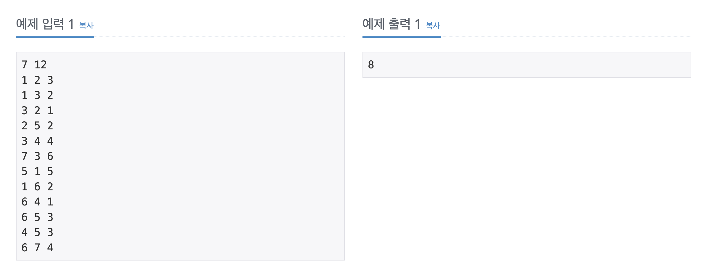 첫째 줄에 집의 개수 N, 길의 개수 M이 주어진다. N은 2이상 100,000이하인 정수이고, M은 1이상 1,000,000이하인 정수이다. 그 다음 줄부터 M줄에 걸쳐 길의 정보가 A B C 세 개의 정수로 주어지는데 A번 집과 B번 집을 연결하는 길의 유지비가 C (1 ≤ C ≤ 1,000)라는 뜻이다.